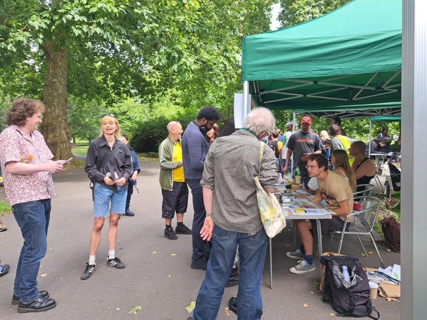 I am just writing to say thank you for organizing such a wonderful, amazing event and for inviting us to speak. It couldn’t have been more perfect – the weather, the crowd, the workshops in the lovely marquee, the stalls, the music and of course our lovely local, community run park. It was a fantastic idea to have this event outside. We had a constant stream of interesting people stopping by at our stall to look at our materials, ask questions and make inquiries about workshops – and the people from the 56a infoshop took lots of our fliers to display in their shop. We enjoyed meeting the other groups and the leisurely time to chat at their stallse. I am already looking forward to the next one.